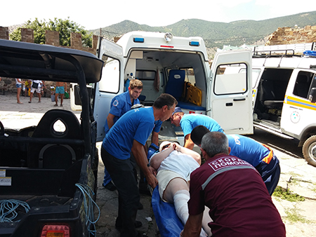 На место происшествия выехала группа спасателей Судакского аварийно-спасательного отряда «КРЫМ-СПАС» в составе 6-ти человек и 1 ед. техники. По прибытии на место, спасатели совместно с медицинскими работниками оказали первую помощь пострадавшей – на пострадавшую ногу наложили шину. Посредством специальных носилок силами спасателей пострадавшая туристка, жительница г. Курган 1969 г.р., была транспортирована к автомобилю скорой медицинской помощи. По словам спасателей, одной из основных причин происшествия послужила обувь пострадавшей, не предназначенная для скальных восхождений, туристка была обута в сланцы.