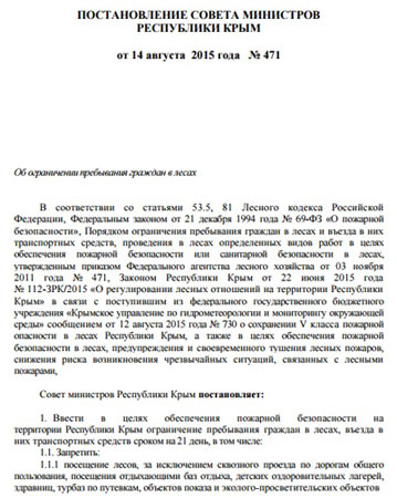 Сегодня Совет министров Республики Крым постановлением №471 продлил ограничение на пребывание граждан в лесах еще на 21 день, т.е. до 5 сентября 2015 года.
