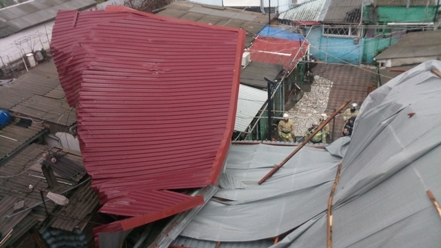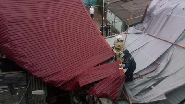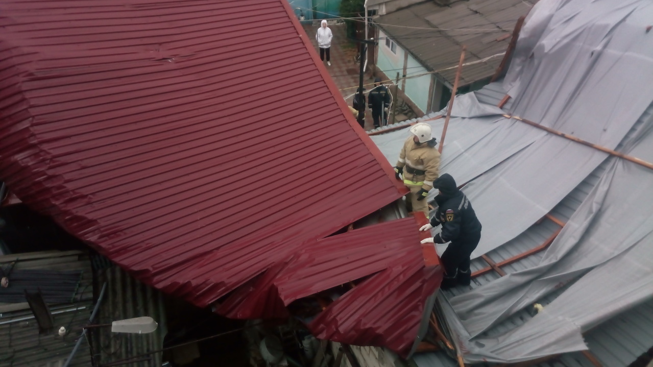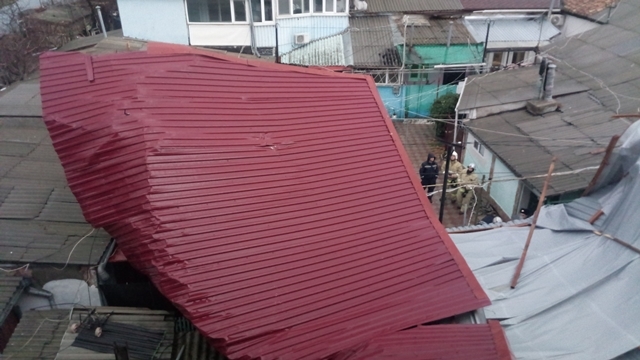 В г.Феодосии шквальным ветром сорвало кровлю, которая обрушилась на жилой дом и проезжую часть. Требовалась помощь спасателей в разборе конструкции.