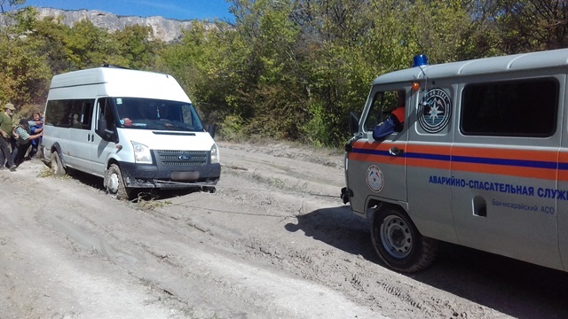 Так, Сергей Шахов сообщил, что вчера в 11:50, во время патрулирования горно-лесной зоны в районе Баштановского водохранилища, к сотрудникам Бахчисарайского отряда «КРЫМ-СПАС» обратился житель Московской области с заявлением о том, что на туристической тропе в размытом после дождей грунте застрял его микроавтобус с автоприцепом, перевозивший 14 велотуристов с велосипедами, из них 2 несовершеннолетних. Требуется помощь спасателей.