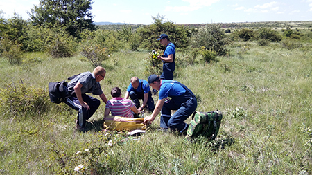 Немного позже, в 13:44 оперативному дежурному «КРЫМ-СПАС» г. Симферополь поступила информация о том, что на западном отроге Долгоруковской яйлы, в районе долины р. Кизилкобинка (окрестности с. Перевальное Симферопольского р-на), во время туристической прогулки жительница с. Укромное Симферопольского района 1976 г.р. в результате неосторожности упала и получила травму ногу, возможно ее перелом, не может самостоятельно продолжить движение.